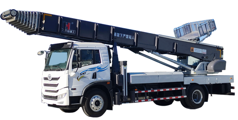 36米云梯車可傳送 400kg 重的貨物,用于高度小于36 米的高空裝卸作業(yè)。該云梯車主要由車架總成、云梯總成、小車總成、轉(zhuǎn)臺總成、卷揚機總成、液壓系統(tǒng)總成、電氣系統(tǒng)總成等組成。傳送貨物時,4 個液壓支撐伸出,加強了整機的穩(wěn)定性。 該云梯車,采用一汽解放底盤,整車重量控制在4.5噸以內(nèi),掛藍牌,C1駕照就可駕駛,免購置稅,不需要操作證,非營運車輛,使用期限30 年。